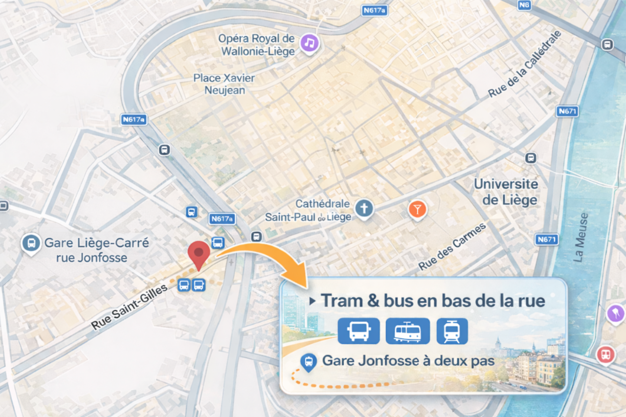 Studios pour étudiantes et étudiants au sein d'un ensemble immobilier en intérieur d'ilôt avec accès sécurisé, autour d'une cour intérieure de 100 m² très au calme. Situation exceptionnelle en plein centre de Liège près des commerces, du carré, d'HEC, Ste-Julienne, HEL, ULiège, à 30 mètres de l'arrêt de bus n°48 vers le campus de l'ULiège au Sart-Tilman.